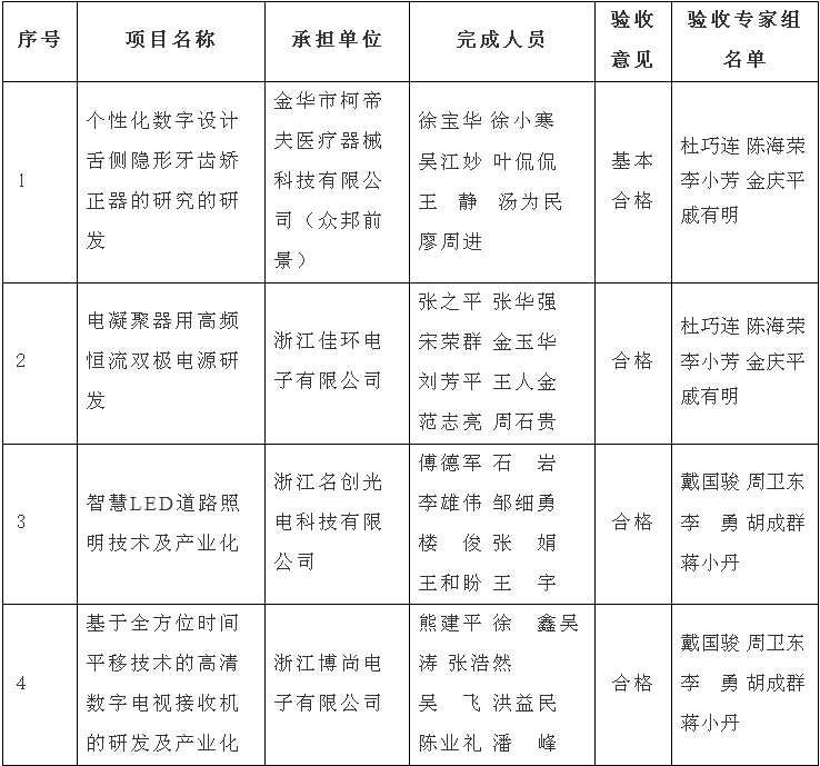 根據《金華市級科技計劃項目驗收管理辦法》(金市科字〔2015〕83號)規定,現將金華市柯帝夫醫療器械科技有限公司(眾邦前景)、浙江佳環電子有限公司、浙江名創光電科技有限公司、浙江博尚電子有限公司承擔的《個性化數字設計舌側隱形牙齒矯正器的研究的研發》、《電凝聚器用高頻恒流雙極電源研發》、《智慧LED道路照明技術及產業化》和《基于全方位時間平移技術的高清數字電視接收機的研發及產業化》4個市級科技計劃項目驗收結果予以公示,接受社會監督,公示期從2018年1月10日至1月17日止。