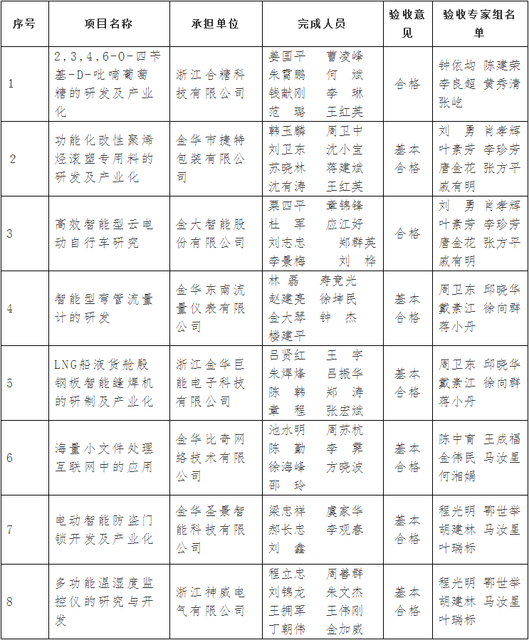 根據《金華市級科技計劃項目驗收管理辦法》(金市科字〔2015〕83號)規定,現將浙江合糖科技有限公司、金華市捷特包裝有限公司、金大智能股份有限公司、金華東南流量儀表有限公司、浙江金華巨能電子科技有限公司、金華比奇網絡技術有限公司、金華圣景智能科技有限公司、浙江神威電氣有限公司承擔的《2,3,4,6-O-四芐基-D-吡喃葡萄糖的研發及產業化》、《功能化改性聚烯烴滾塑專用料的研發及產業化》、《高效智能型云電動自行車研究》、《智能型彎管流量計的研發》、《LNG船液貨艙殷鋼板智能縫焊機的研制及產業化》、《海量小文件處理互聯網中的應用》、《電動智能防盜門鎖開發及產業化》和《多功能溫濕度監控儀的研究與開發》8個市級科技計劃項目驗收結果予以公示,接受社會監督,公示期從2018年6月8日至6月15日止。