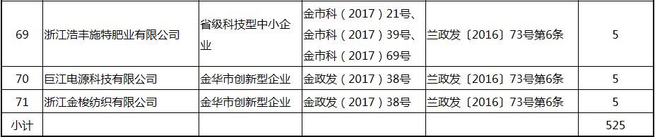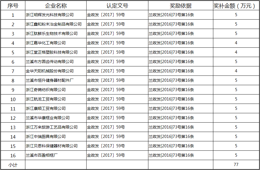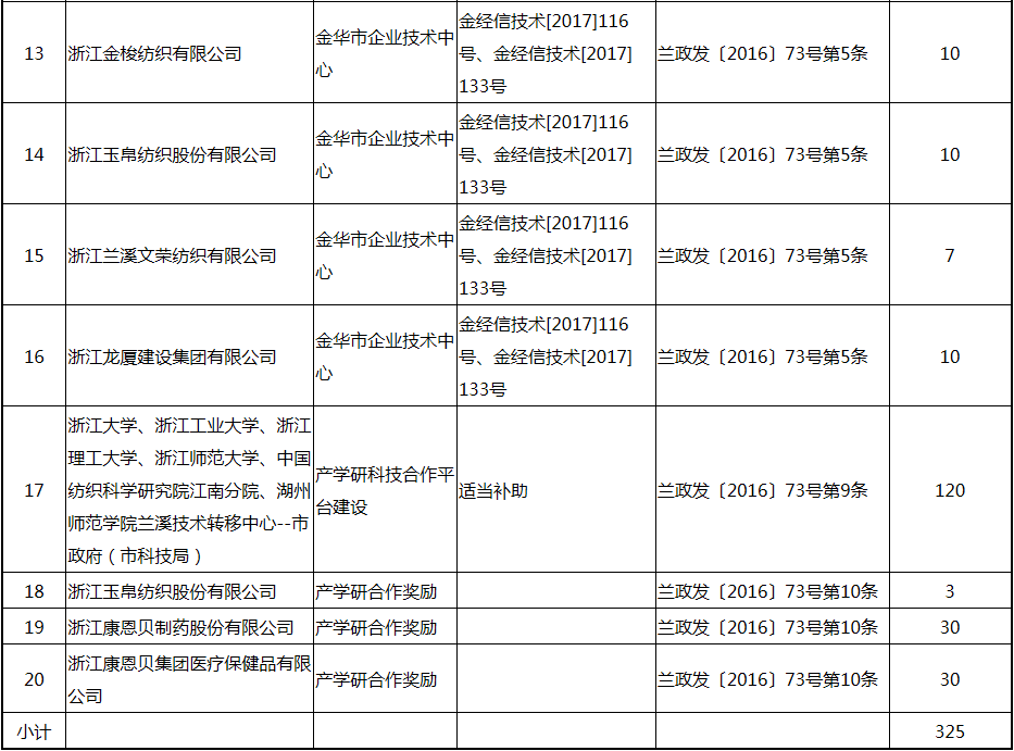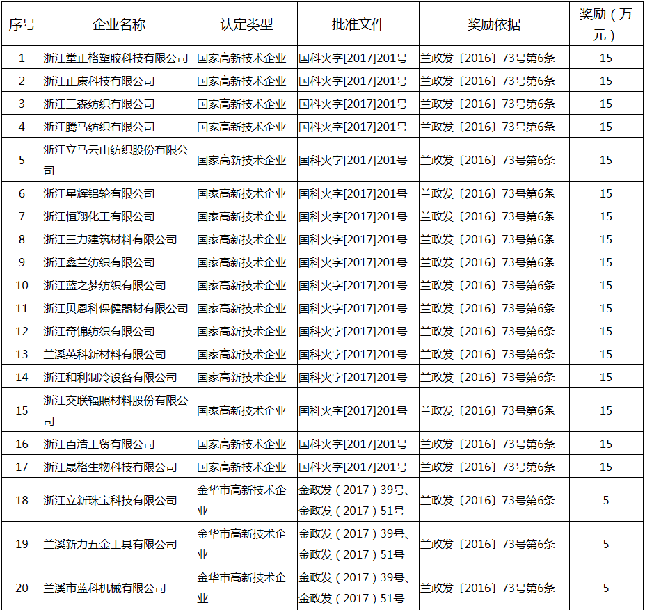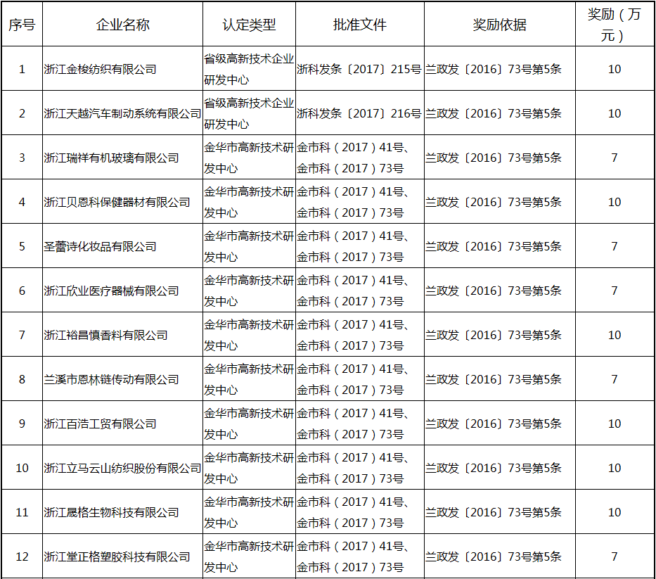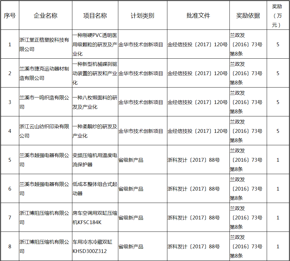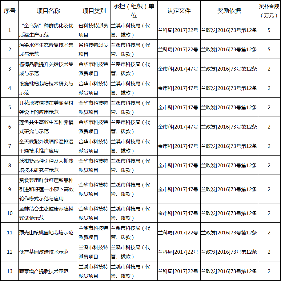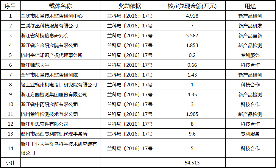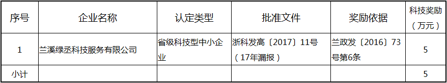 根據《關于實施創新驅動戰略大力推進大眾創業萬眾創新的若干意見》(蘭政發〔2016〕73號)和《蘭溪市科技創新券實施管理辦法》(蘭科局〔2016〕17號)等文件精神,現將2017年度科技創新專項資金獎勵及補助方案予以公示,公示期五個工作日,自2018年  7月3日至 7月9日。公示期內,如對公示擬補助對象有疑議的,請及時向市科技局辦公室反映。