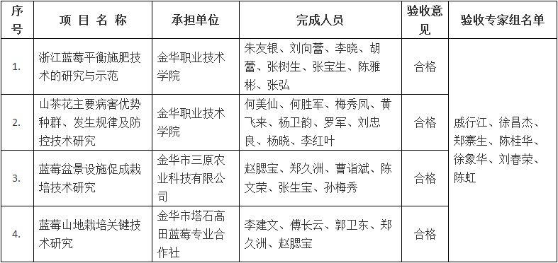 根據《金華市級科技計劃項目驗收管理辦法》(金市科字〔2015〕83號)規定,現將金華職業技術學院承擔的《浙江藍莓平衡施肥技術的研究與示范》等市級科技計劃項目驗收結果予以公示,接受社會監督,公示期從2018年7月17日至2018年7月24日止。任何單位和個人對驗收意見持有異議的,應當在公示期內書面向市科技局提出異議,單位應采用書面形式并加蓋公章,個人應采用實名提出異議。