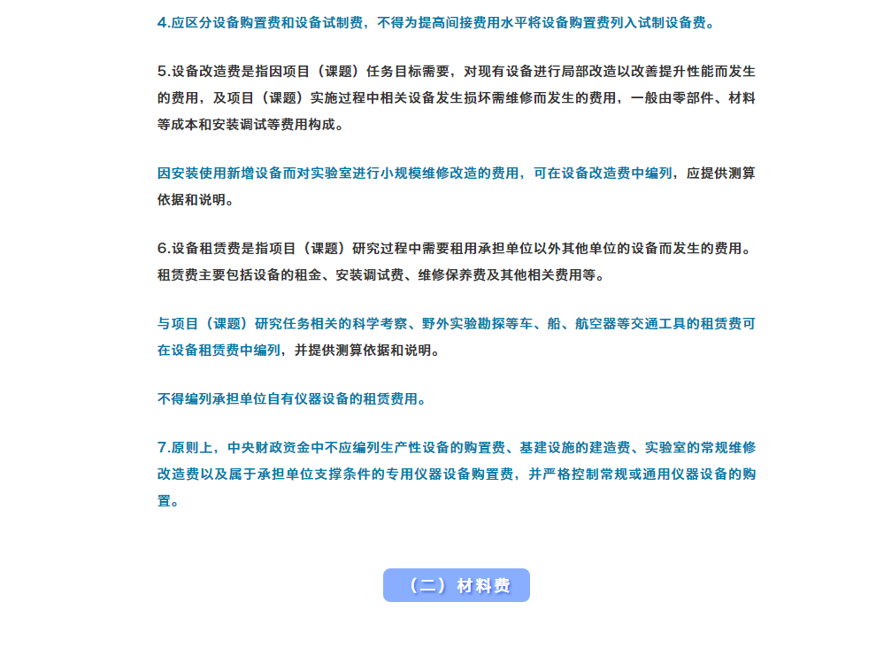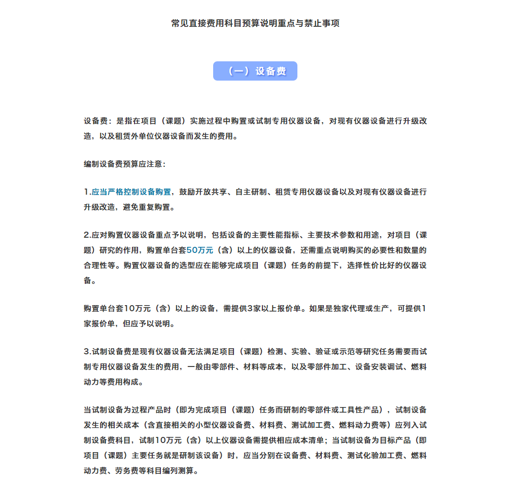 設備費:是指在項目(課題)實施過程中購置或試制專用儀器設備,對現有儀器設備進行升級改造,以及租賃外單位儀器設備而發生的費用。