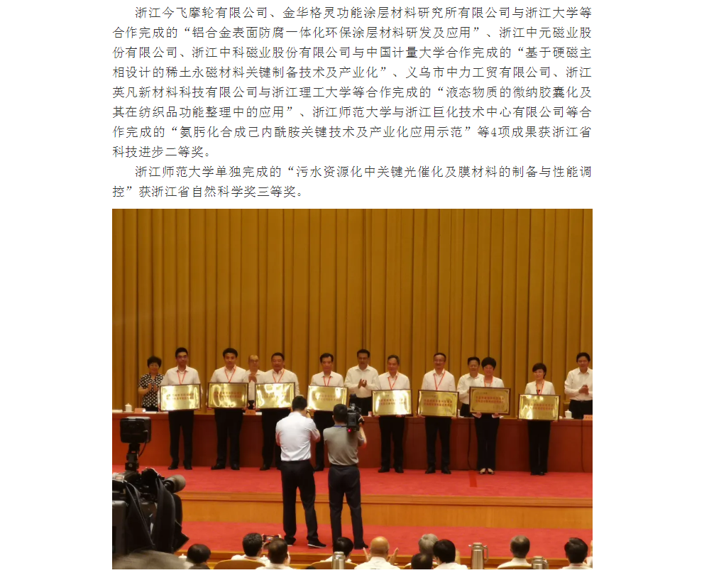 浙江萬里揚股份有限公司牽頭與北汽福田汽車股份有限公司、金華市計量質量科學研究院等合作完成的“商用車變速器輕量化、模塊化技術的研究及產品開發”、橫店集團東磁股份有限公司單獨完成的“無線充電用高磁導率FS500鐵氧體片”、浙江道明光電科技有限公司與道明光學股份有限公司完成的“符合ECE R104微棱鏡型反光膜關鍵技術研發及產業化”、金華市中醫醫院單獨完成的“脾腎陽虛血瘀型腎衰的理論基礎及腎毒寧方干預機制研究”、金華市公路與運輸管理中心牽頭與東南大學等合作完成的“浙江省重載干線公路車轍機理與路基路面一體化防治技術”、浙江綠巨人生物技術有限公司與浙江大學等合作完成的“適宜糖尿病食用高抗性淀粉水稻種質創制、機理特性及產業開發”、義烏市中醫醫院與浙江省立同德醫院合作完成的“丹溪學派的傳承發展與著述研究”、金華市農業科學研究院、金華市荊龍生物科技有限公司、浙江壽仙谷醫藥股份有限公司與浙江農林大學等合作完成的“金線蓮優異種質創新及生態栽培關鍵技術研究與應用”、國網浙江省電力有限公司金華供電公司與杭州電力設備制造有限公司等合作完成的“新型開關設備態勢感知與智能運維關鍵技術及產業化”、東陽市人民醫院與杭州電子科技大學等合作完成的“面向健康養老的人機共融智能監陪護系統關鍵技術及應用”、浙江凱文磁業有限公司與中國計量大學等合作完成的“新能源汽車用高耐熱沖擊釹鐵硼關鍵制備技術及其電機應用”、浙江師范大學與杭州醫學院等合作完成的“基于浙江實踐的農村衛生發展策略研究”等12項成果獲浙江省科技進步獎三等獎。