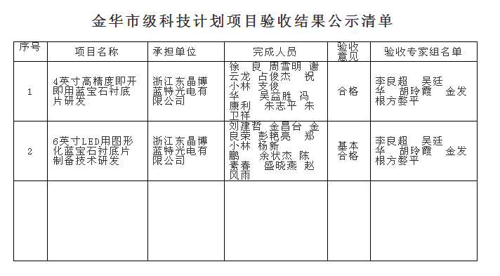 根據《金華市級科技計劃項目驗收管理辦法》(金市科字〔2015〕83號)規定,現將浙江東晶博藍特光電有限公司承擔的《4英寸高精度即開即用藍寶石襯底片研發》和《6英寸LED用圖形化藍寶石襯底片制備技術研發》2個市級科技計劃項目驗收結果予以公示,接受社會監督,公示期從2017年7月31日至8月6日止。任何單位和個人對驗收意見持有異議的,應當在公示期內書面向市科技局提出異議,單位應采用書面形式并加蓋公章,個人應采用實名提出異議。